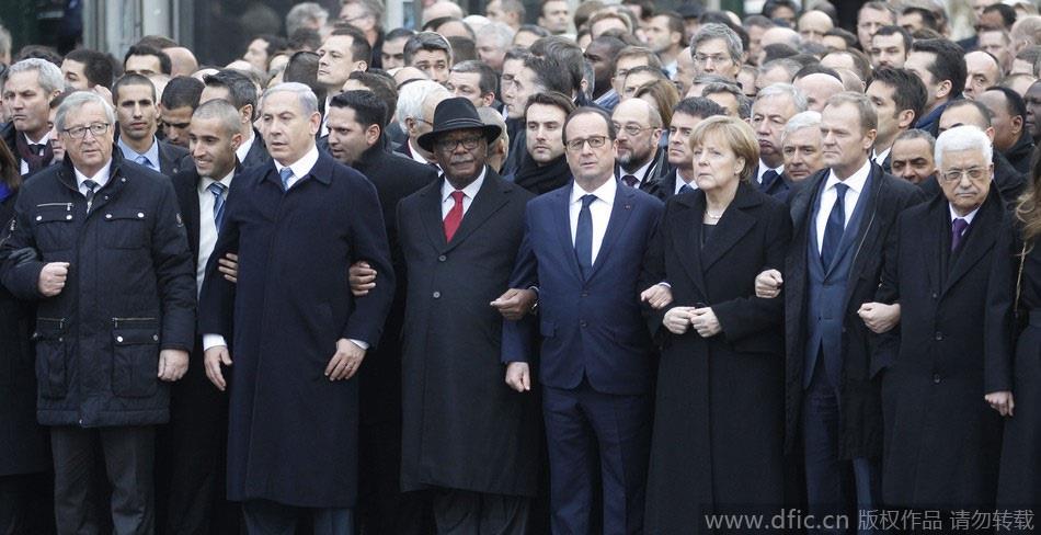 Liderler, Fransa Cumhurbaşkanı François Hollande ile kol kola girerek terörü protesto etti.