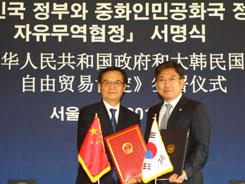 Çin Ticaret Bakanı Gao Hucheng ve KC Ticaret, Sanayi ve Enerji Bakanı Yoon Sang-jick anlaşmaya imza attıktan sonra ortak basın toplantısı yaptı.