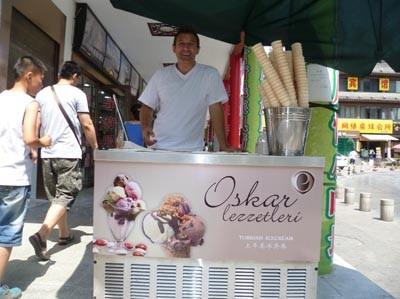 09.07.2013 CRI - Türkiye'nin özgün lezzetlerinden Kahramanmaraş'ın ünlü dövme dondurması artık Çin'de de satılıyor. Maraş dondurmasını Çin'e taşıyan Halil Doğan, Türk oldukları için büyük ilgi gördüklerini söylüyor.